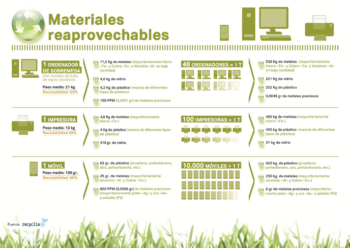 El 93% de los materiales de un ordenador de sobremesa son reciclables mediante las actuales técnicas de tratamiento empleadas en plantas autorizadas, según un estudio de la plataforma medioambiental Recyclia y la empresa Recybérica Ambiental. Este dato confirma que el PC registra el mayor índice de reaprovechamiento de materias primas de las diez categorías de residuos de aparatos eléctricos y electrónicos (RAEE) establecidas en el Real Decreto 208/2005, que regula su gestión medioambiental.